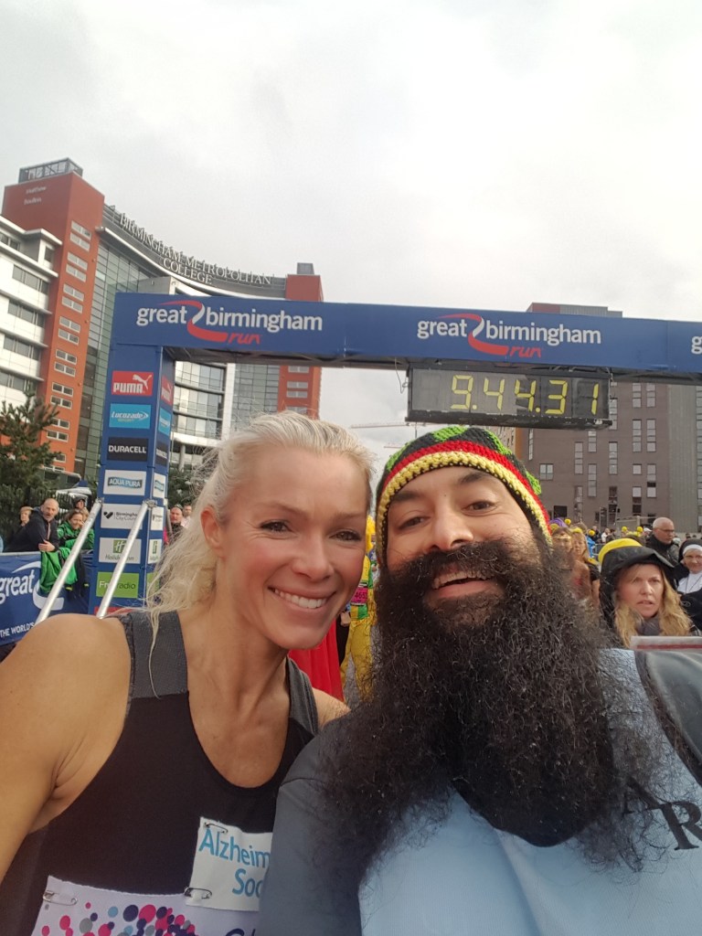 Let’s get back to Sunday 16th in Birmingham. I was asked if I would be interested in coming to the start line 30 minutes before the start to meet someone who was going to help launch the Birmingham marathon and was also running the half that day. I said sure, why not. I was asked to be discreet about who I was meeting and I remember on the day bumping into a few running friends and telling them I couldn’t chat as I needed to go to the start line. Some of them were bemused wondering why I was starting so far forward! Anyway I met, chatted to and had some photos taken with Nell McAndrew! I’ll be honest she does the Bolt pose better but she is a very good runner. A sub 3 hour marathon runner and a PB of 85 minutes in the half. Meeting her was the highlight of the day. We’ve remained in touch since and she has been known to give me the odd retweet when I take on a new running challenge.