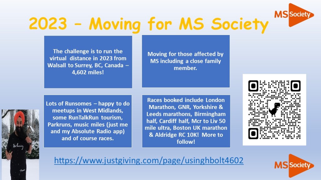 Hi. The time since my last blog has been longer than I thought. Since that last blog I have ran my 50th official marathon at Yorkshire and have also announced my running challenge for 2023! SO in 2023 I will be running for MS Society, https://www.mssociety.org.uk/. The challenge is to attempt to run 4,602 miles in the calendar year. I know! A very specific distance. Oh, you meant that’s a lot of miles. It is a big distance to attempt, double my highest milage in one year (2021). This is the distance from my house to my cousins house near Vancouver, Canada. He’s younger than me and was diagnosed with MS about 5 years ago and it’s had a big impact on his mobility and other motor skills. So in 2023 I want to move for MS, grateful that I can do something I love so much.